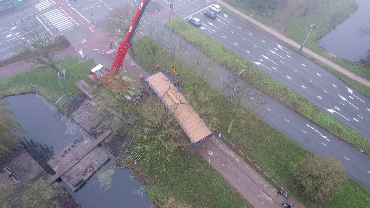 Op de video is te zien hoe de geprefabriceerde brug wordt opgehaald bij de staalfabriek van GKB in Barendrecht. De brug wordt getransporteerd naar Spijkenisse waar de brug door een hijskraan op de klaarliggende landhoofden wordt gehesen. Een bijkomstig voordeel van prefabricatie is dat de uitvoeringsduur op locatie aanzienlijk wordt ingekort en de buurt snel gebruik kan maken van de nieuwe brug!